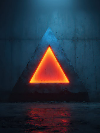 A glowing neon triangle illuminated against a dark concrete wall, creating a striking visual effect. The modern design evokes a sense of mystery and allure.
