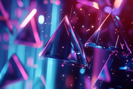 This image features abstract geometric forms illuminated by vivid neon lighting. The composition employs a dark backdrop, enhancing the brightness of the colors. It suggests a modern, digital aesthetic. Suitable for various creative projects, including visual design and advertising applications. The play of light creates a visually dynamic effect.