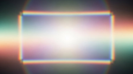 An abstract light leak effect with soft focus, showcasing rainbow prism colors forming a bright, blurred rectangular glow against a dark background.