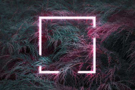 Creative fluorescent color layout made of natural green leaves with pink neon light square.