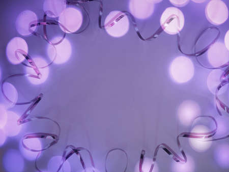 Festive background of ribbon, glitters and bokeh on white background. Copy space.