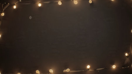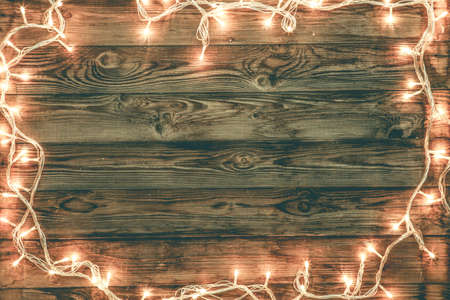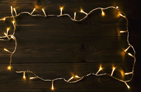 Christmas or New Year fairy lights frame on dark wooden table. Christmas or New year background with copy space.