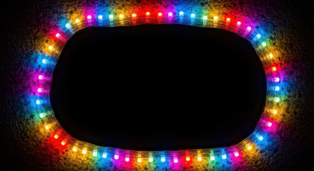 A vibrant frame of glowing rainbow colored LED lights creating an oval border around a central black copy space, perfect for festive or technology themes.