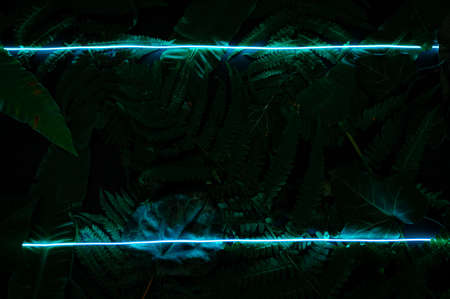 Concept of green leaves and neon blue light. Flat lay photo on the black backdrop.