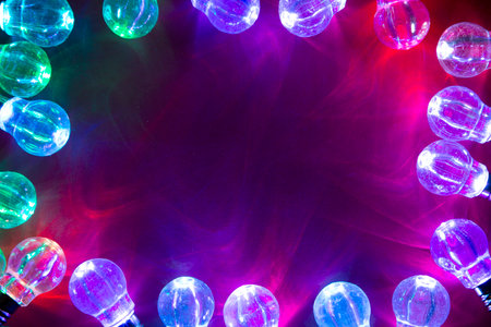 Colorful led garland on black background. Space for text.