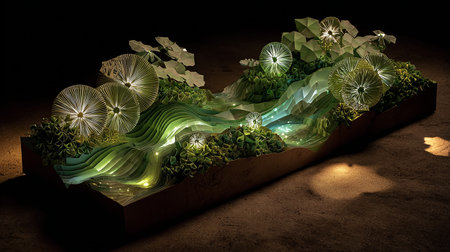 A stunning contemporary art installation showcases a variety of ferns and flora, preserved and displayed within illuminated glass panels. The vibrant green lighting creates a futuristic and scientific atmosphere, blending nature with modern design to explore themes of preservation and ecology.