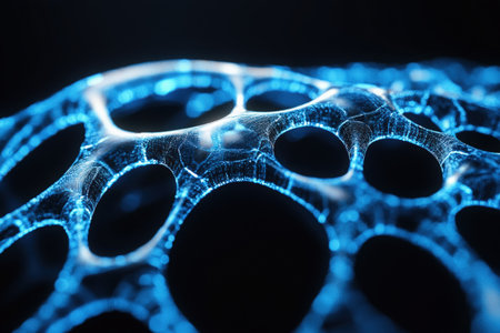 A stunning macro image captures a network of interconnected, glowing blue cells against a deep black backdrop, revealing intricate details.