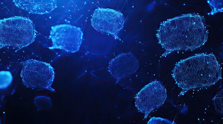 Dark blue abstract banner with glowing speech bubbles and polygonal patterns. Perfect for communication, dialogue, and virtual networking concepts with ample space for text.