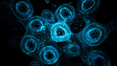 An artistic illustration showcases multiple biological cells, each featuring a layered orange core encapsulated within a translucent, blue-tinged membrane. The image utilizes a shallow depth of field, with soft focus on certain areas. Suitable for scientific publications, educational resources, or conceptual design projects.