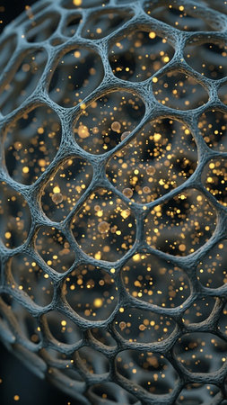 A detailed macro shot of a complex, porous spherical structure with numerous glowing golden particles floating around it.