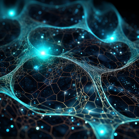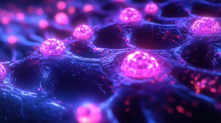 Explore a stunning close-up view of glowing cells within an abstract environment. This digital illustration captures vibrant colors and intricate details, ideal for scientific or artistic projects.