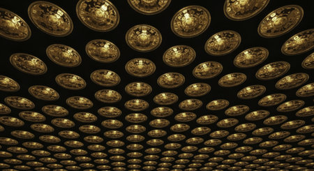 Modern architectural ceiling featuring a repeating pattern of circular golden decorative elements, creating a luxurious and opulent background.
