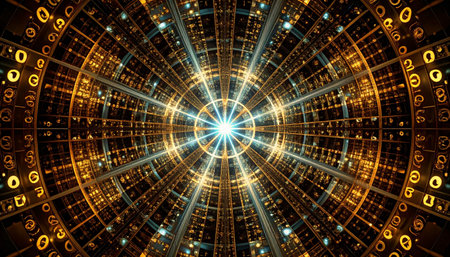 Circular digital patterns with pulsating light effects create a mesmerizing display