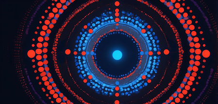An abstract digital illustration presents a circular design comprised of concentric rings and radiating lines. The color palette includes orange, blue, and white elements against a dark backdrop. The composition suggests a technological or scientific concept, lending itself to various commercial and design projects.