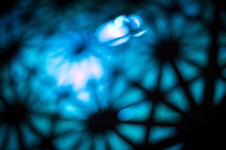 Bright blue bokeh lights shining through black geometric patterns