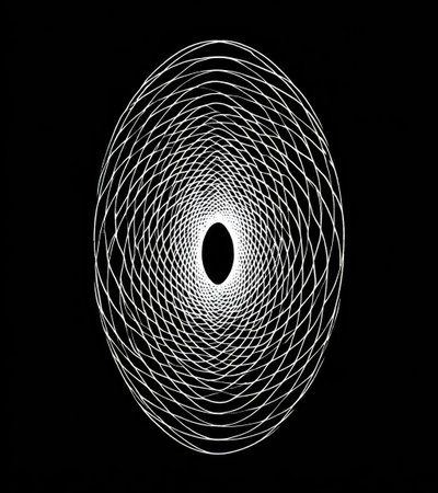 An abstract image features a central oval composed of numerous white lines on a stark black backdrop. The lines intersect and curve, creating a complex pattern and visual depth. The lighting is uniform, highlighting the geometric design. Suitable for use in design projects, presentations, or other conceptual applications.