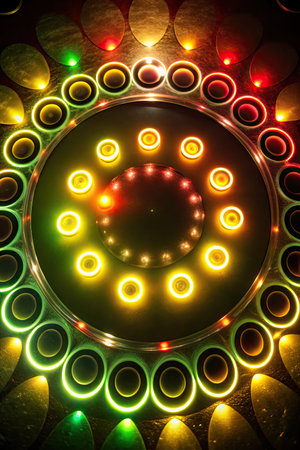 Circle neon lights with sparkling dots, bright colorful laser lights background, modern nightlife and party concept, disco and dancing nightclubs pattern