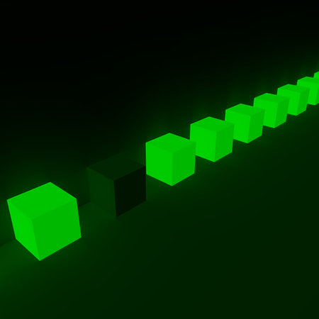 green glowing cubes in line, one corrupt