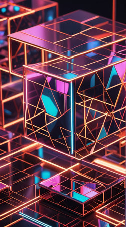 3d rendering of abstract geometric background with neon glowing cubes and lines