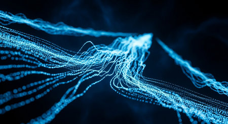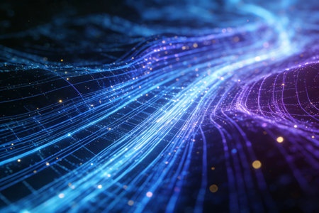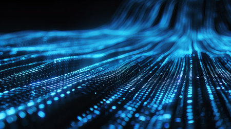 This mesmerizing image features flowing blue light waves with sparkling digital particles, set against a dark background, creating a captivating futuristic atmosphere.