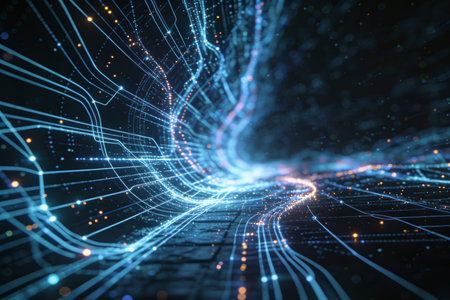Abstract digital pathways with glowing data streams symbolizing the flow of information in technological processes