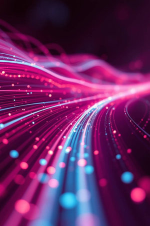 Abstract swirling trails of neon blue and pink light create a dynamic and futuristic background with a bokeh effect of small glowing particles.