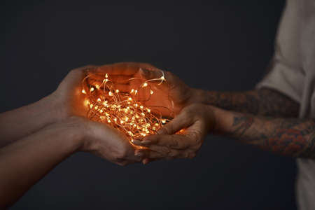 closeup of Caucasian male hand covered in small garland of Christmas lights in the dark