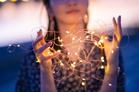 Christmas and Happy New Year decorations lighting in the hands of young women