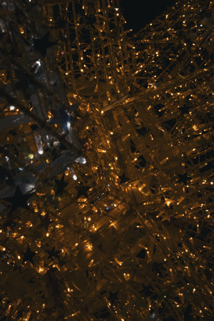 Beautiful New Year or Christmas glowing city garland decoration around tree with shallow depth of field and multiple bokeh of city lights in the blurred background