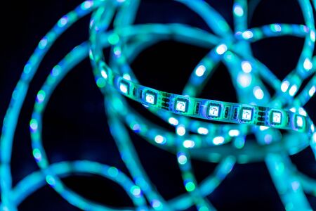 Abstract background of colorful lines in motion on black. Bokeh of defocused curves, blurred neon blue and red leds, festive or business backdrop of serpantine, holidays and celebrations