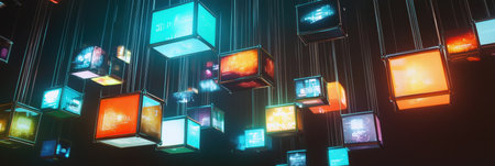 Colorful floating cubes with various abstract symbols and images create a dynamic digital atmosphere, showcasing modern multimedia elements.