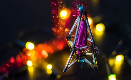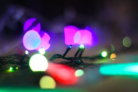 Beautiful Christmas background with garlands and bokeh. New year multi-colored picture. Abstract photo image for design