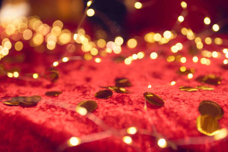 Festive Christmas garland of golden light bulbs shiny background with sequins and sparkles. Party celebration concept
