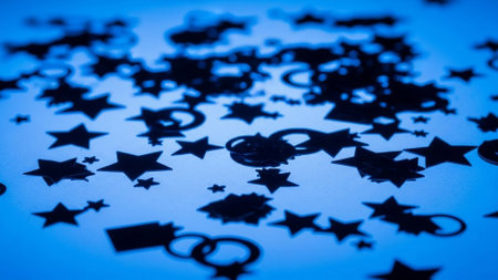 Stars confetti on a blue background. Shallow depth of field.