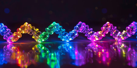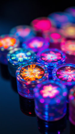 A captivating display of colorful bokeh lights, creating a festive and abstract background with beautiful reflections on a dark, glossy surface.