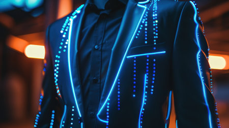 A close-up of a persons hands interacting with luminous technology. A fiber optic bracelet glows with a cool blue light, while a warm orange glow emanates from their palms, symbolizing the seamless integration of humanity and futuristic innovation.