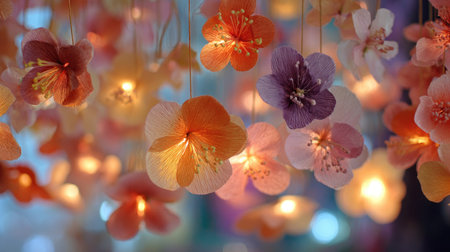 A stunning display of colorful paper flowers hanging elegantly against a soft illuminated background, perfect for enhancing event decor and sunny moods.