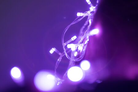 Christmas lights. Lights on a purple blurred background. Christmas and New Year background