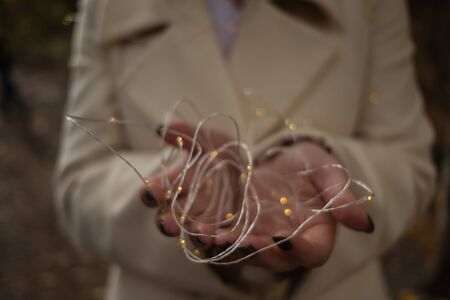 Copper string light in woman hands. Christmas mood and atmosphere. Blurred photos, bokeh.