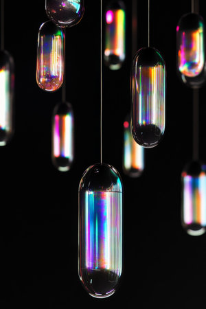 A series of black capsules with iridescent coatings, suspended as if in zero gravity, shimmering with prismatic colors as they hover against a stark black backdrop.
