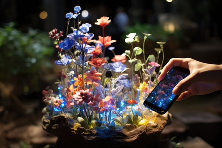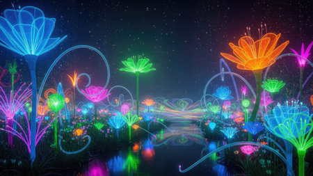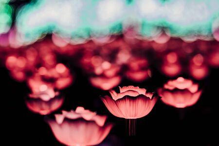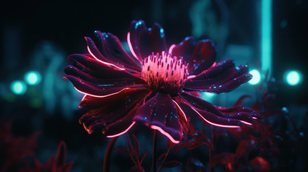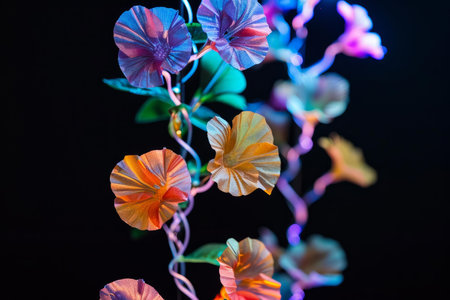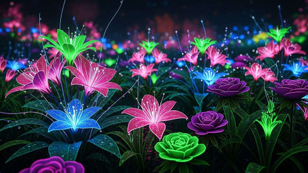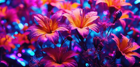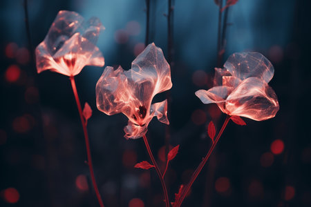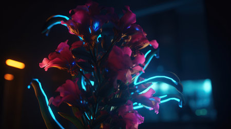 Image of a bouquet of flowers in the dark illuminated by LED bulbs.,Generated by AI