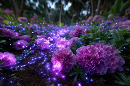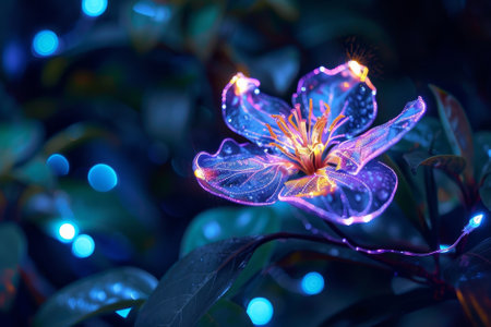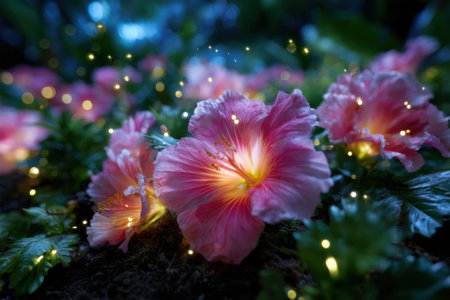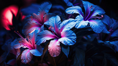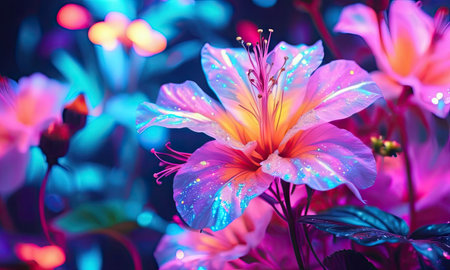 Experience a mesmerizing close-up of vibrant flora illuminated by enchanting blue and pink bokeh lights, creating a magical nighttime atmosphere in nature.