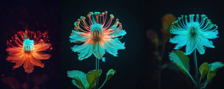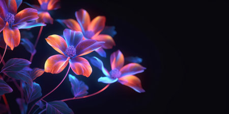 Neon flowers on a black background. 3D rendering. Neon flowers.