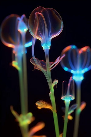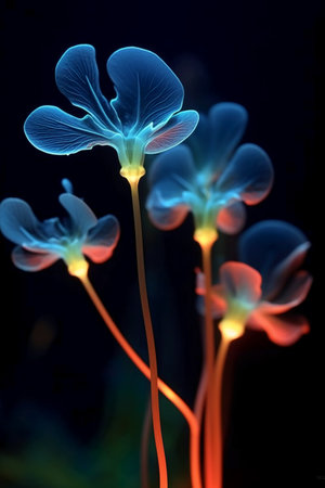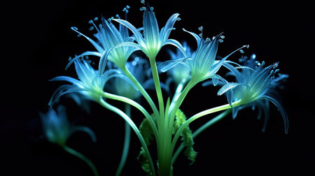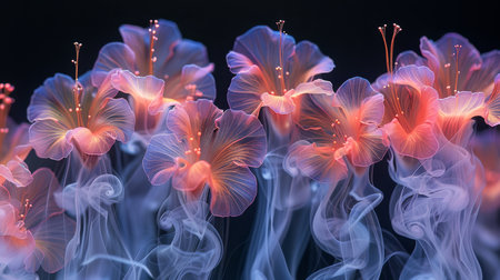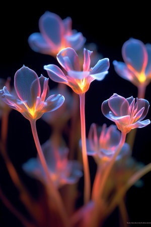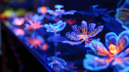 Experience the enchanting beauty of vibrant bioluminescent coral flowers glowing in a dark aquatic setting, capturing the wonders of marine life and organic design.