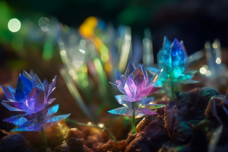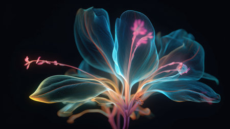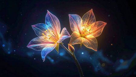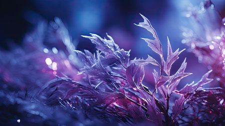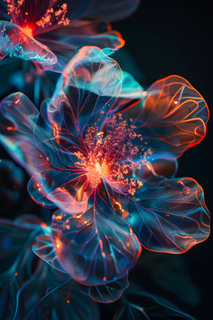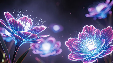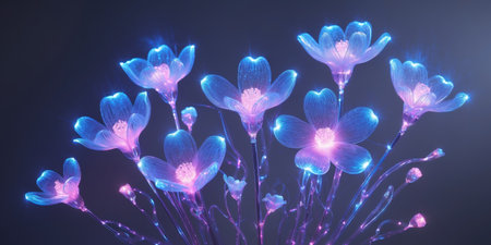 This image showcases stylized floral elements, rendered in a luminous style. The artwork features vibrant shades of purple and blue, with glowing accents. The composition is likely digitally created, with a focus on visual interest. It could be suitable for various creative projects and design applications, as well as editorial purposes.
