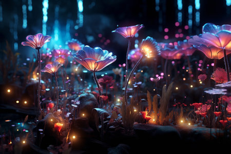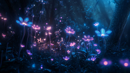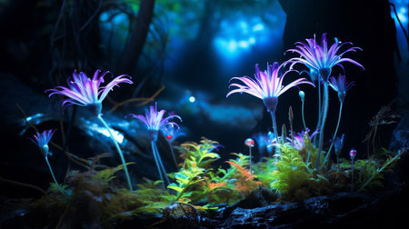 Glowing bioluminescent flowers in a dark, haunted forest generative ai