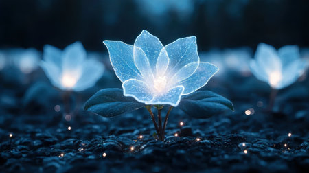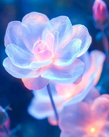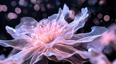 A stunning translucent flower glows softly, surrounded by shimmering particles. The intricate details create an enchanting view, evoking a serene twilight ambiance.