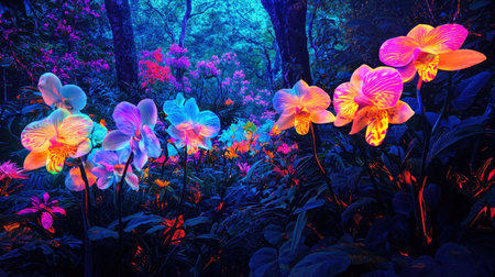 Neon Orchid Forest A captivating glowing landscape of lush tropical orchid flowers in a dense enchanted forest setting with vibrant neon like colors and an ethereal dreamlike atmosphere