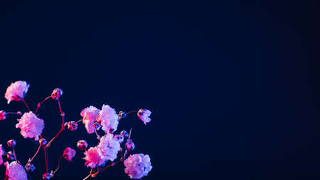 Freesia flowers blooming in pink and blue neon ligh, banner template with copy-space and black background