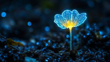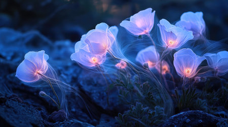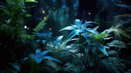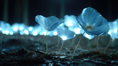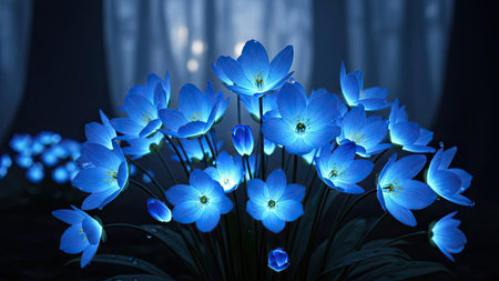The image showcases ethereal blue flowers in a dimly lit forest setting. The flowers emit a soft, internal glow, creating a magical atmosphere. The composition uses selective focus, highlighting the delicate petals and stems against a blurred background. Suitable for various creative and conceptual projects.